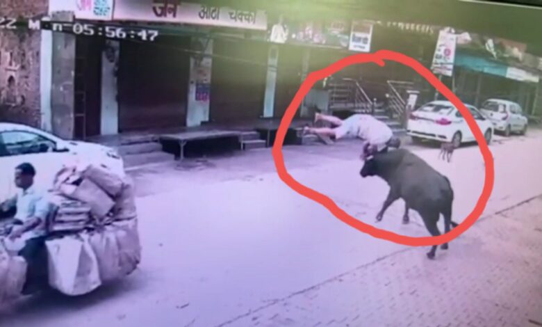 आवारा सांड द्वारा सर्राफा व्यापारी को सर पर उठाकर फेंकने का वीडियो सोशल मीडिया पर हो रहा है जमकर वायरल
